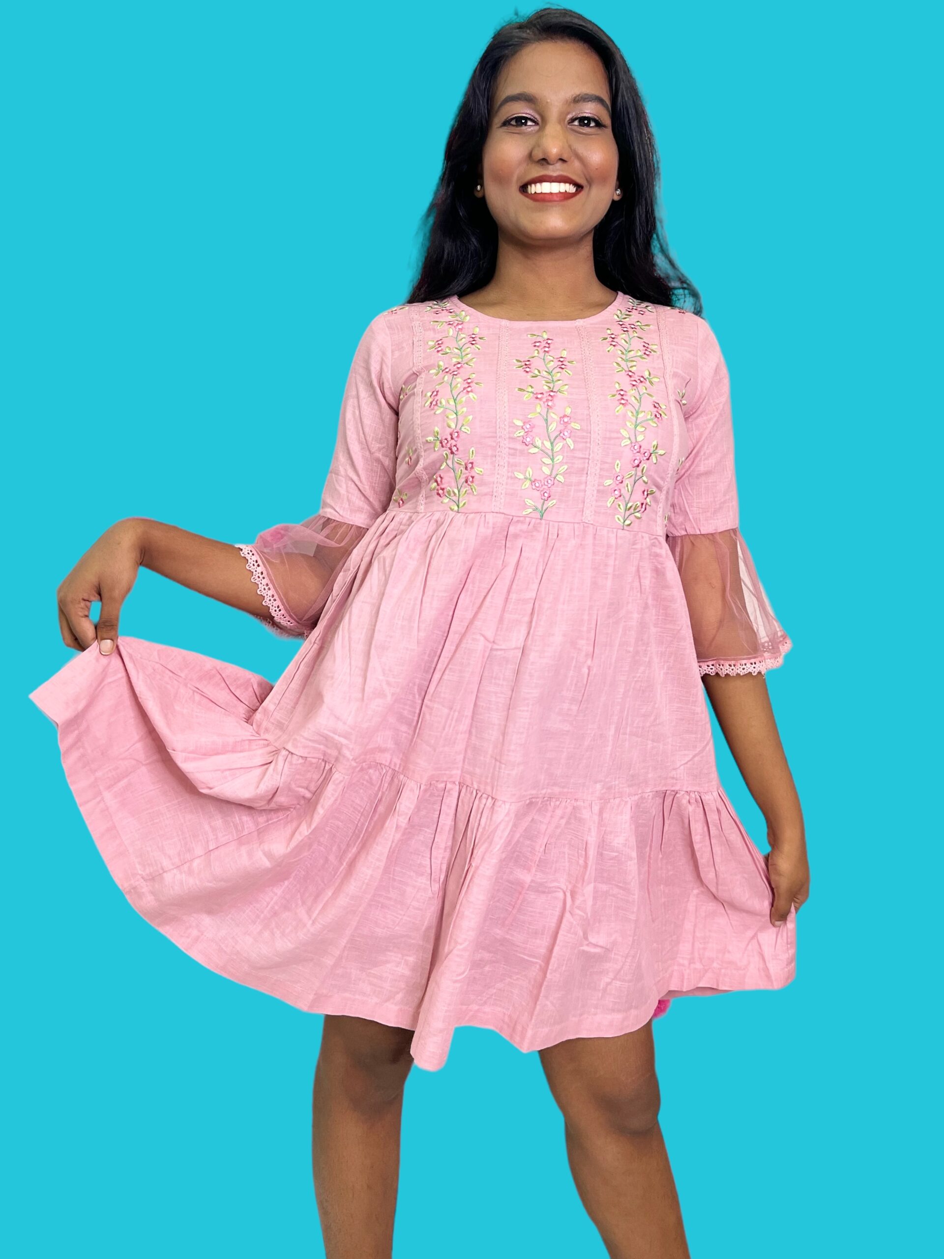 Onion Pink Designer Tunic with Floral Embroidery